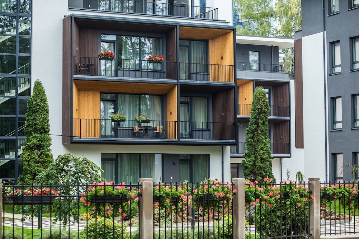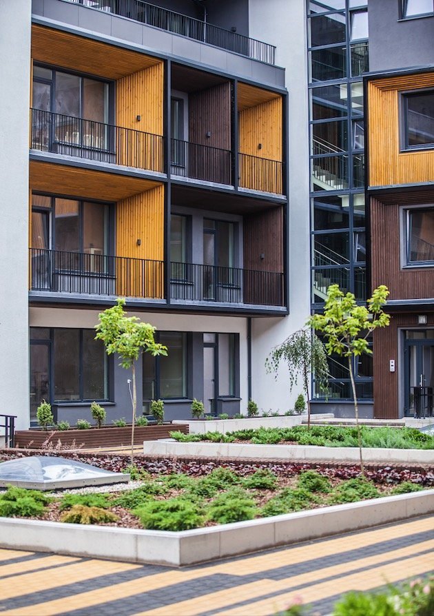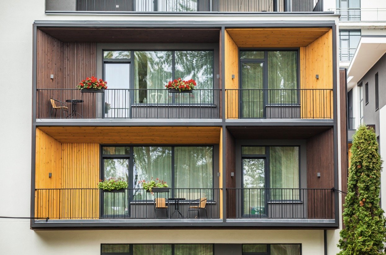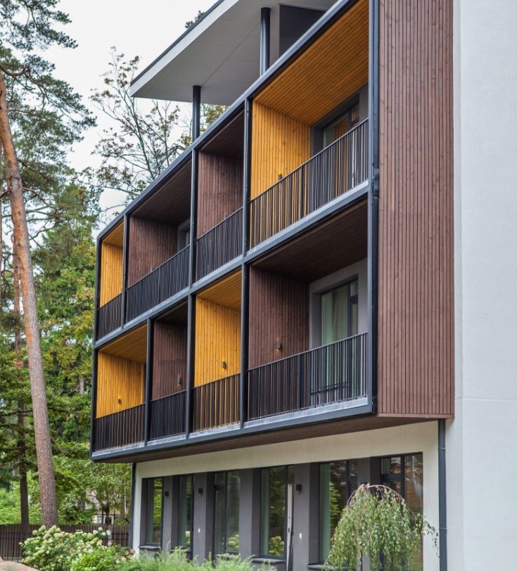 Thermally modified wood pine facade solution for modular house with roof profile